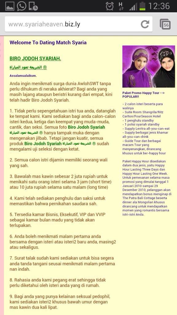 Jasa penyedia istri ini udah lama ada, bisa pesen online pulak. Mereka menyebutnya biro jodoh syariah, promonya menyediakan wanita muda yang cantik dan seksi buat jadi istri kedua, ketiga atau keempat gitu. Lengkap dengan wali si wanita, serta penghulu, saksi dan polisi syariah. Wataaww! Disebutin juga di websitenya boleh ngajak satu ‘istri’ baru untuk bulan madu atau ‘istri2’ lain mau diajak sekaligus juga boleh. Setelah malam pertama udah disiapin surat talak resmi, jadi jangan kuatir wkwkwk. Astajim, apa2an sih nih!